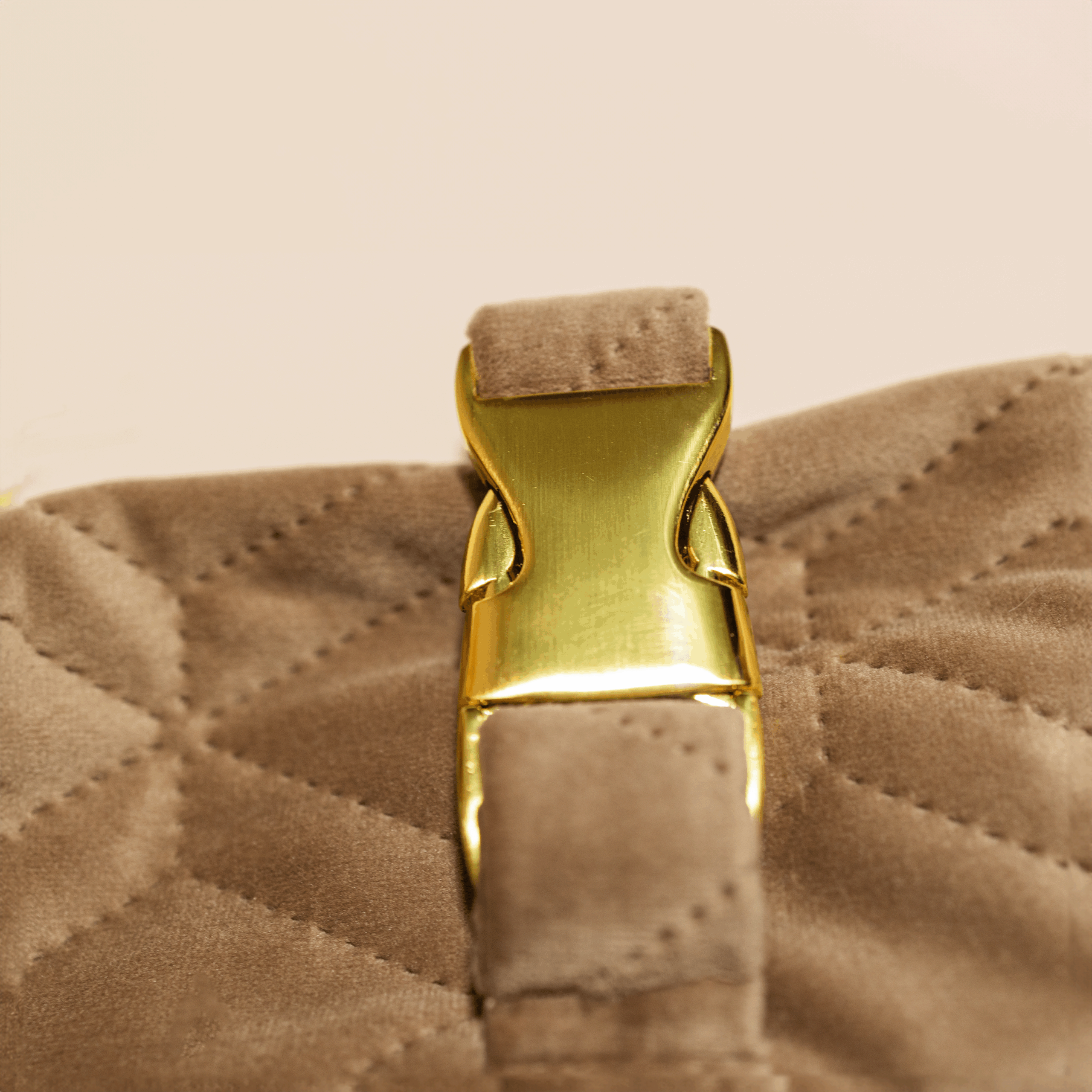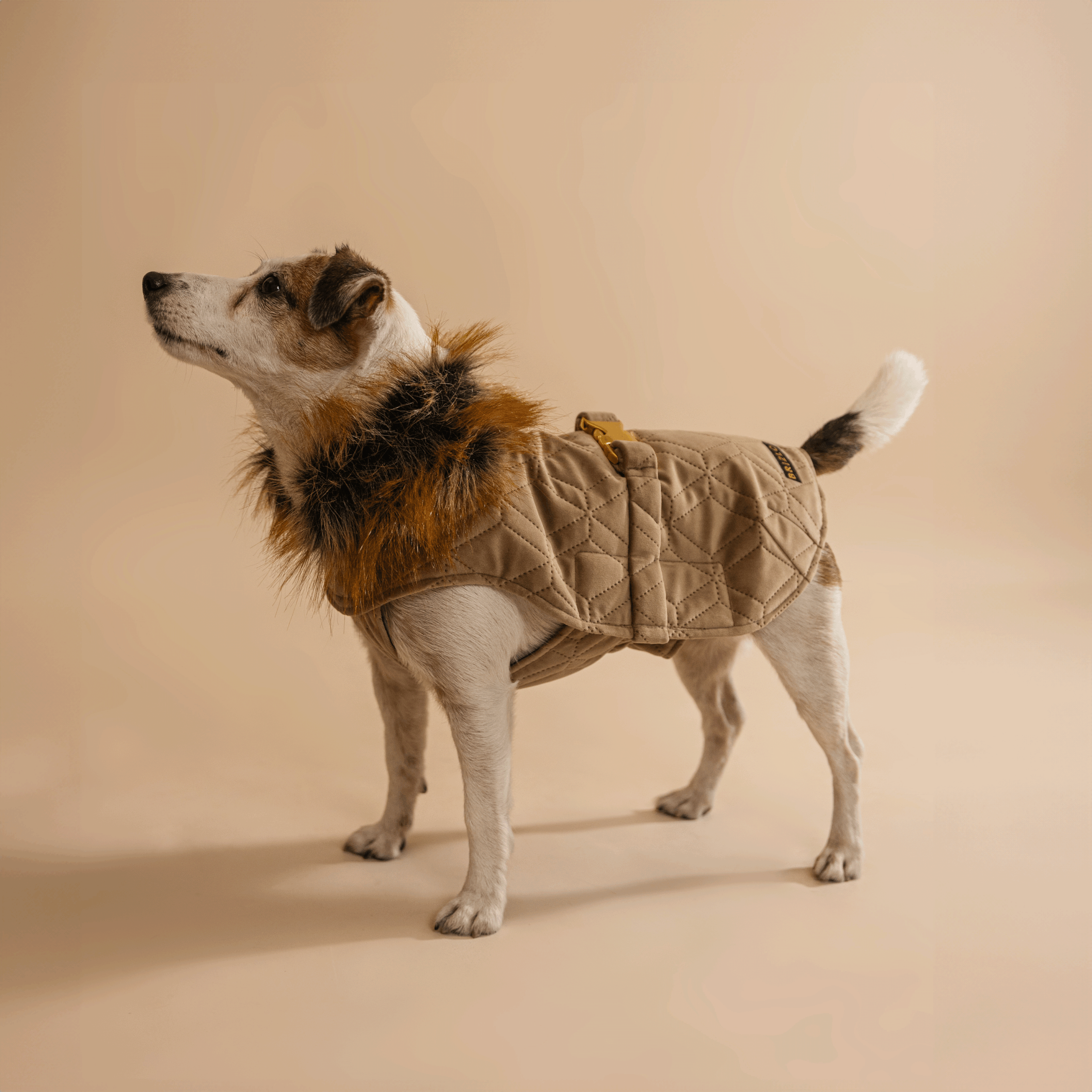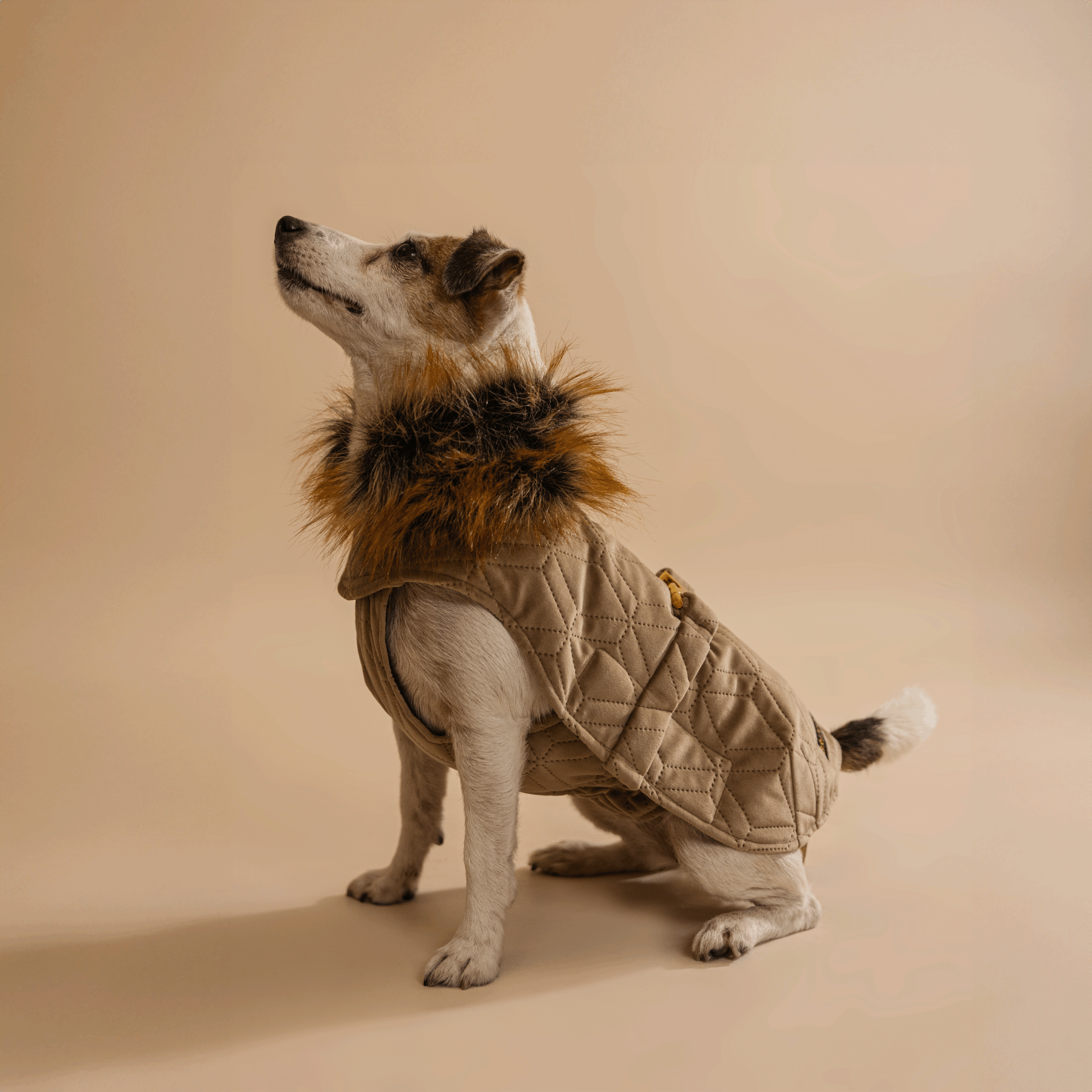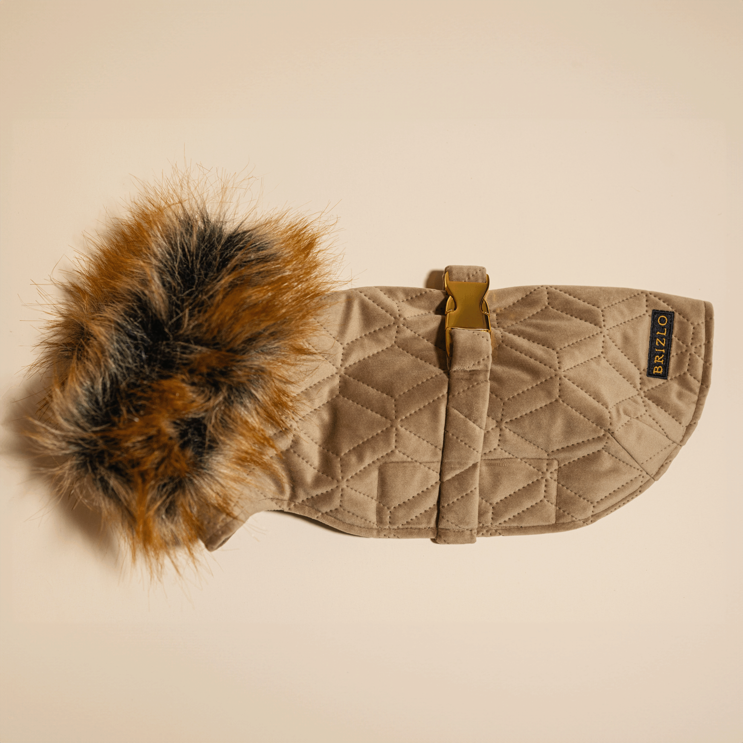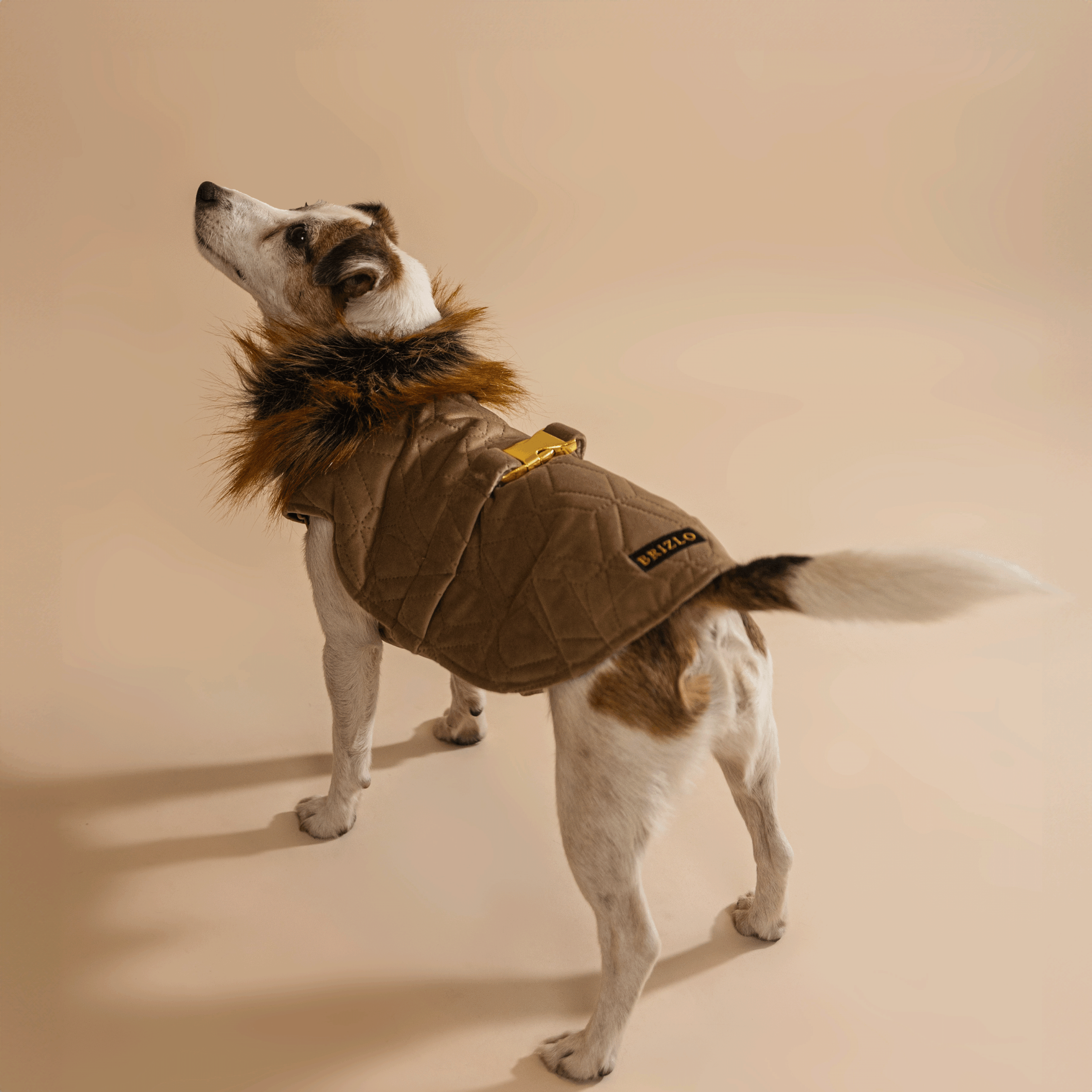 Steppelt, gyémánt mintázatú, cappucino színű bársonyból készült kabátunk, egy különleges, mégis egyedülálló megjelenést biztosít kutyánknak a hideg időjárásban. Kutyaruhánk tökéletes kompozícióját a lecsatoltható műszőrmegallér és az arany színű fémcsat kiegészítők hozzák létre, melyek a gazda öltözködésével teljes szimmetriát alkothatnak. A színkombináció ihletét egy őszi látkép adta, ahol a lehullott levelek már sárgás-barnás árnyalatban pihennek a kopár fák alatt a föld tetején.