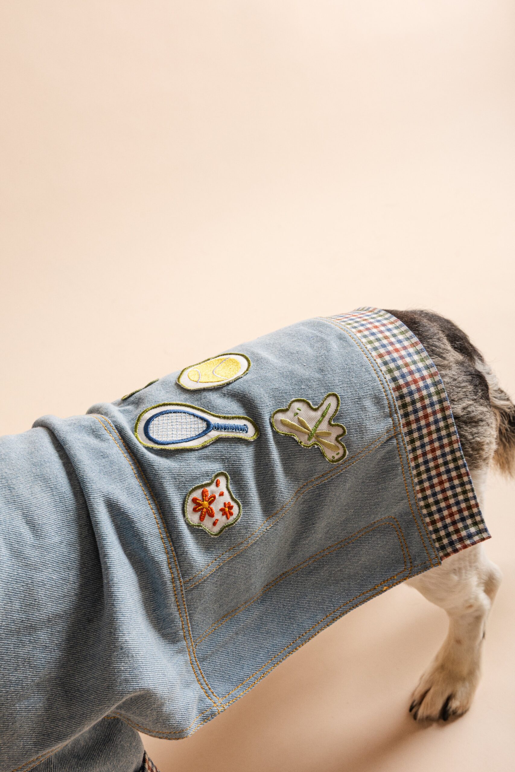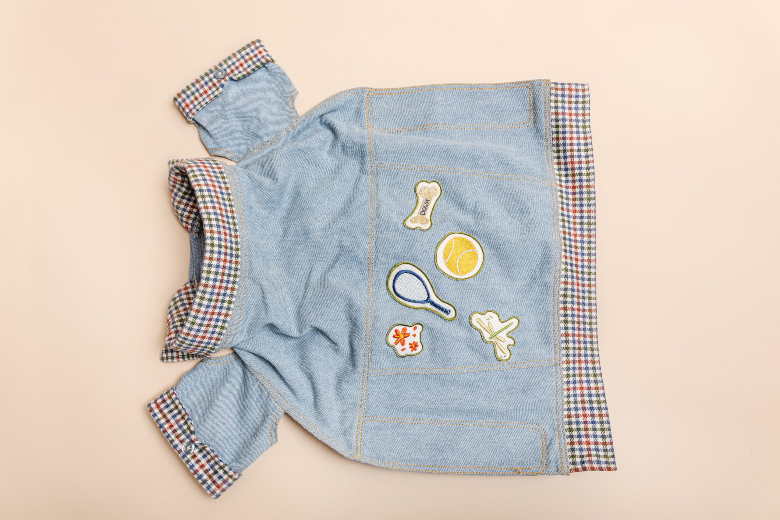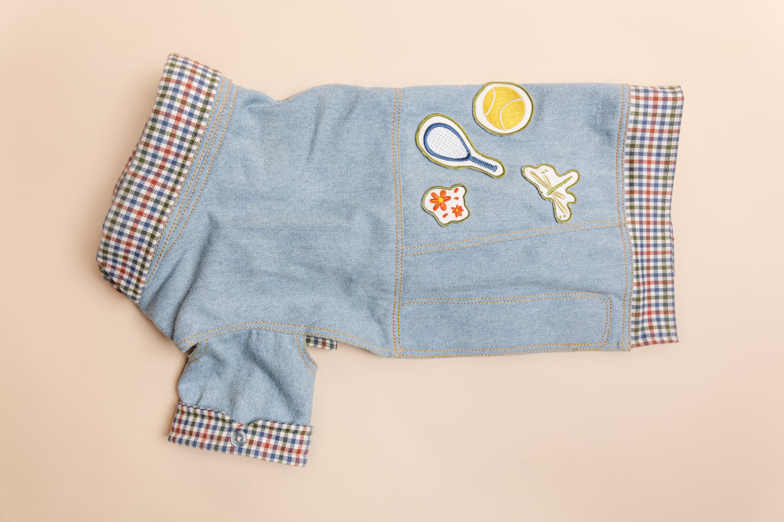 A JUNE BUGZZ kollekció sportos és játékos darabja, a Buzz a nyári teniszpályák és gondtalan szabadtéri délutánok hangulatát hozza el a kutyadivat világába. A világoskék farmerhatású anyagot vidám, hímzett motívumok – teniszütő, labda és virágos részletek – díszítik, melyek a tenniscore stílust ötvözik a ’70-es évek lezser eleganciájával. A gallér és az ujjak színes kockás mintája vidám kontrasztot teremt, miközben még karakteresebbé teszi a megjelenést.