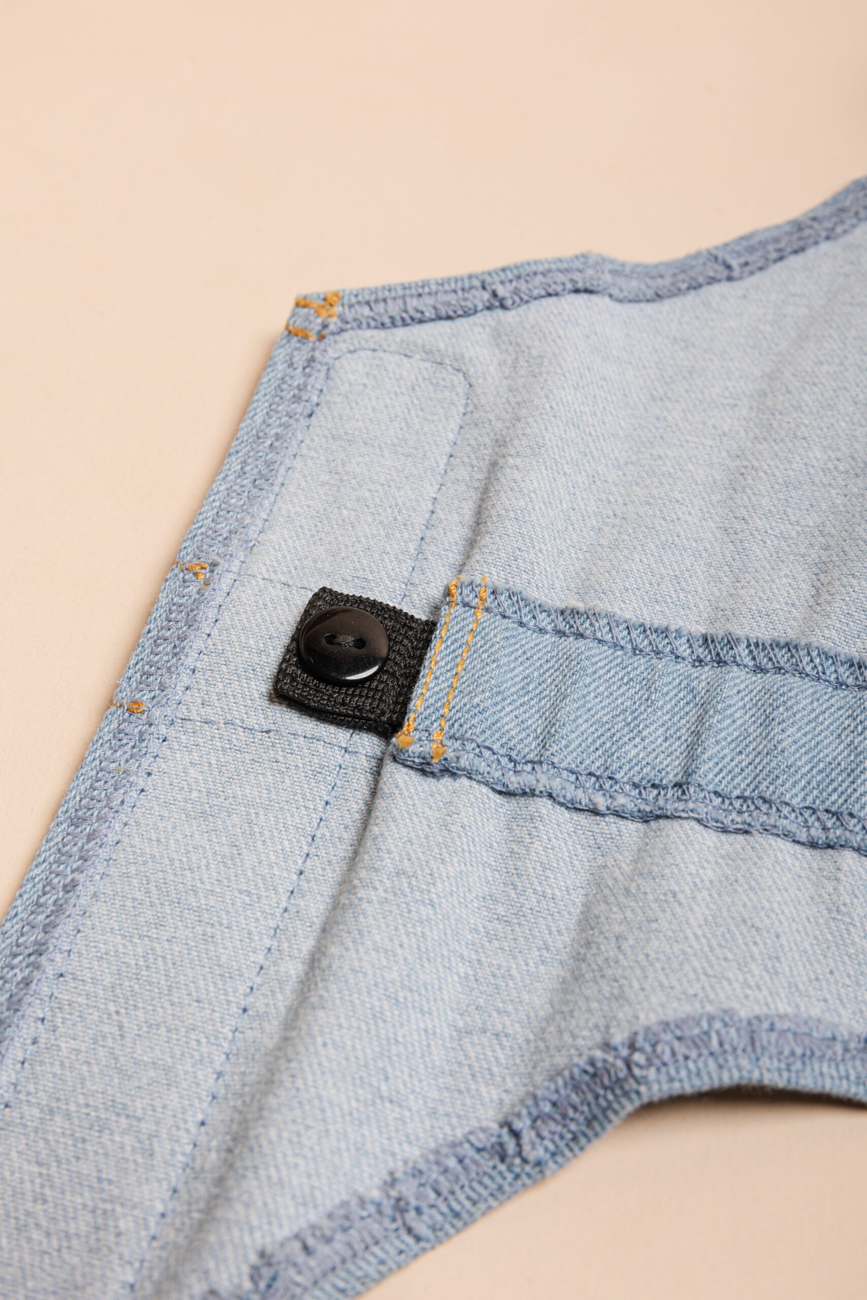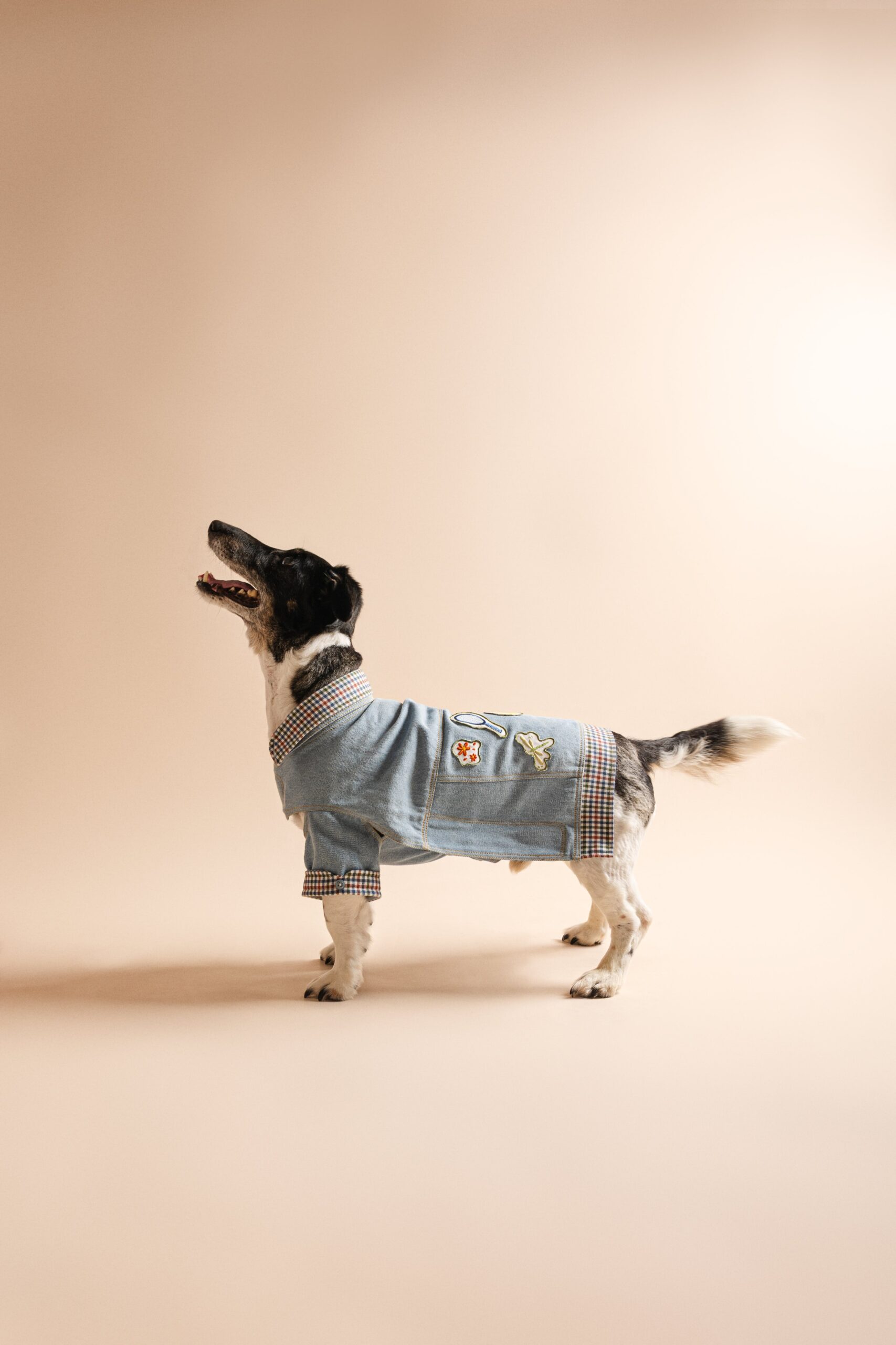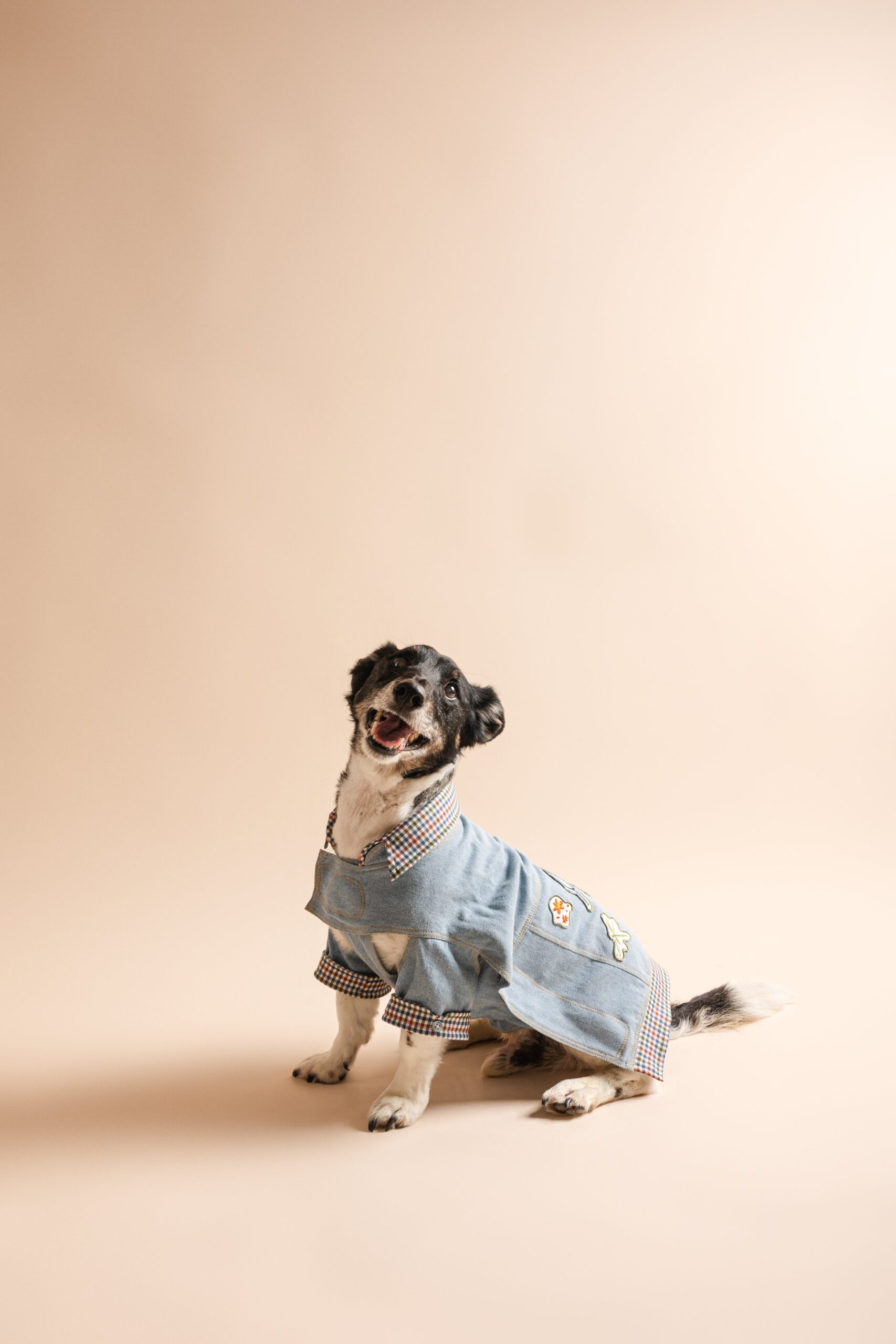 A JUNE BUGZZ kollekció sportos és játékos darabja, a Buzz a nyári teniszpályák és gondtalan szabadtéri délutánok hangulatát hozza el a kutyadivat világába. A világoskék farmerhatású anyagot vidám, hímzett motívumok – teniszütő, labda és virágos részletek – díszítik, melyek a tenniscore stílust ötvözik a ’70-es évek lezser eleganciájával. A gallér és az ujjak színes kockás mintája vidám kontrasztot teremt, miközben még karakteresebbé teszi a megjelenést.