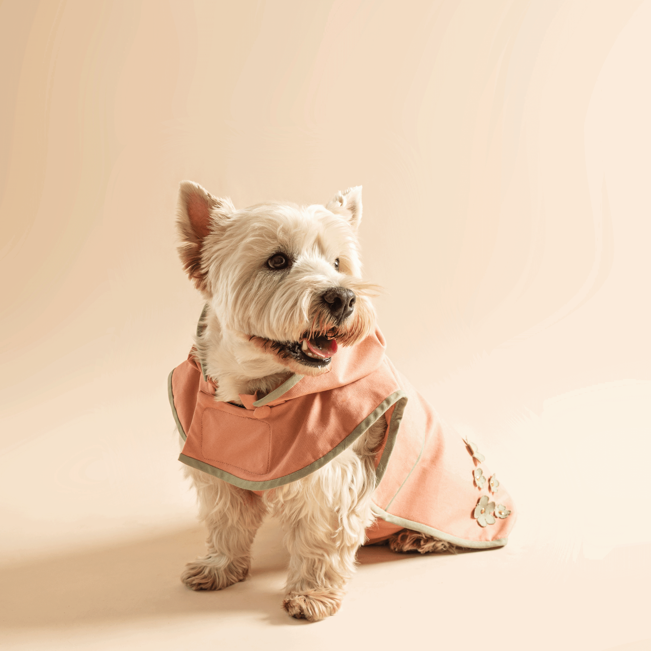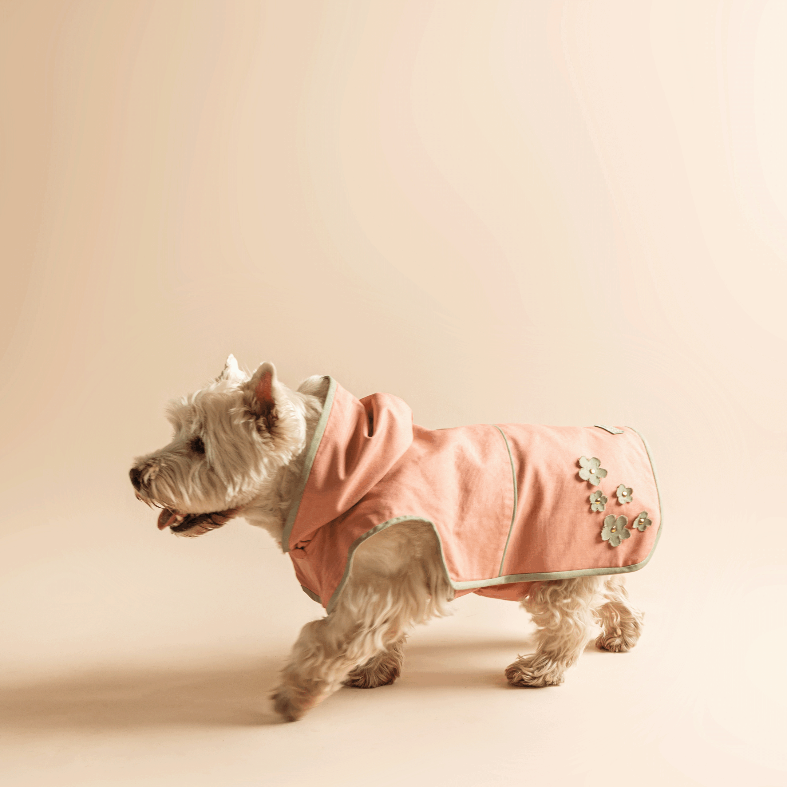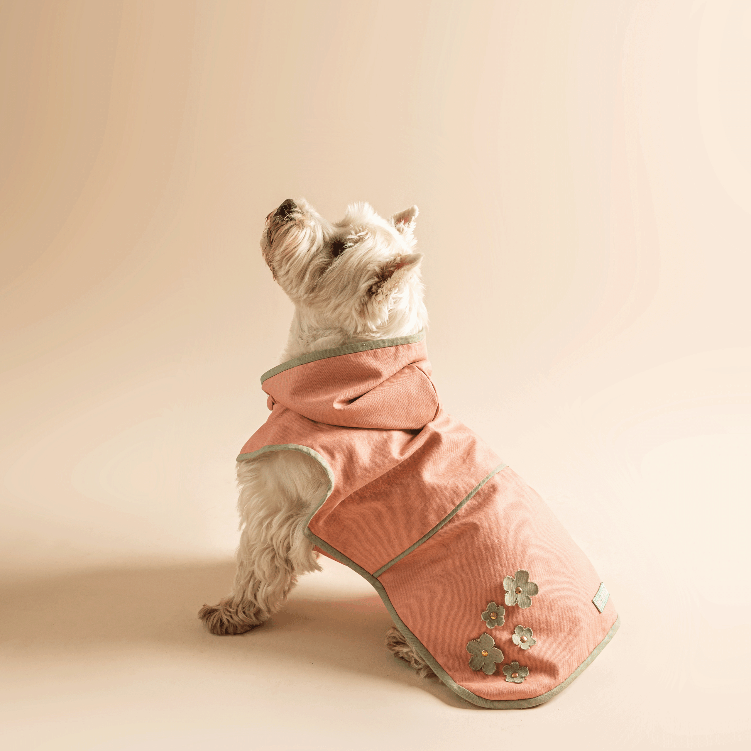 „Daisy” vízlepergető kabátjaink kutyáink legjobb társai lesznek a virágzó cseresznyevirágok árnyalatait megidéző ruhánkban. Oldalán apró virágok teszik varázslatossá megjelenését, mely tökéletes választás az átmeneti időszak és nyár borongós, szeles napjaira.