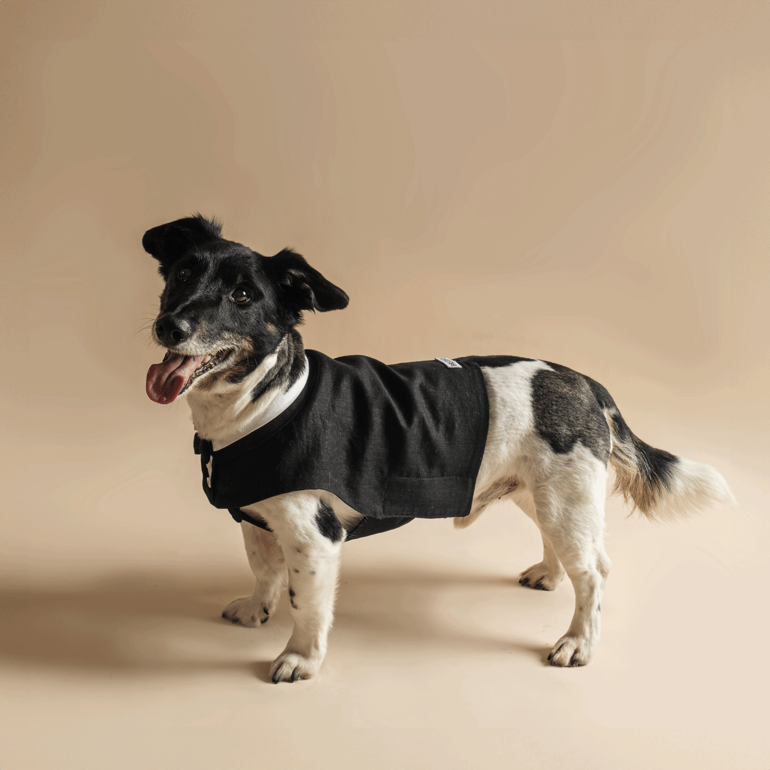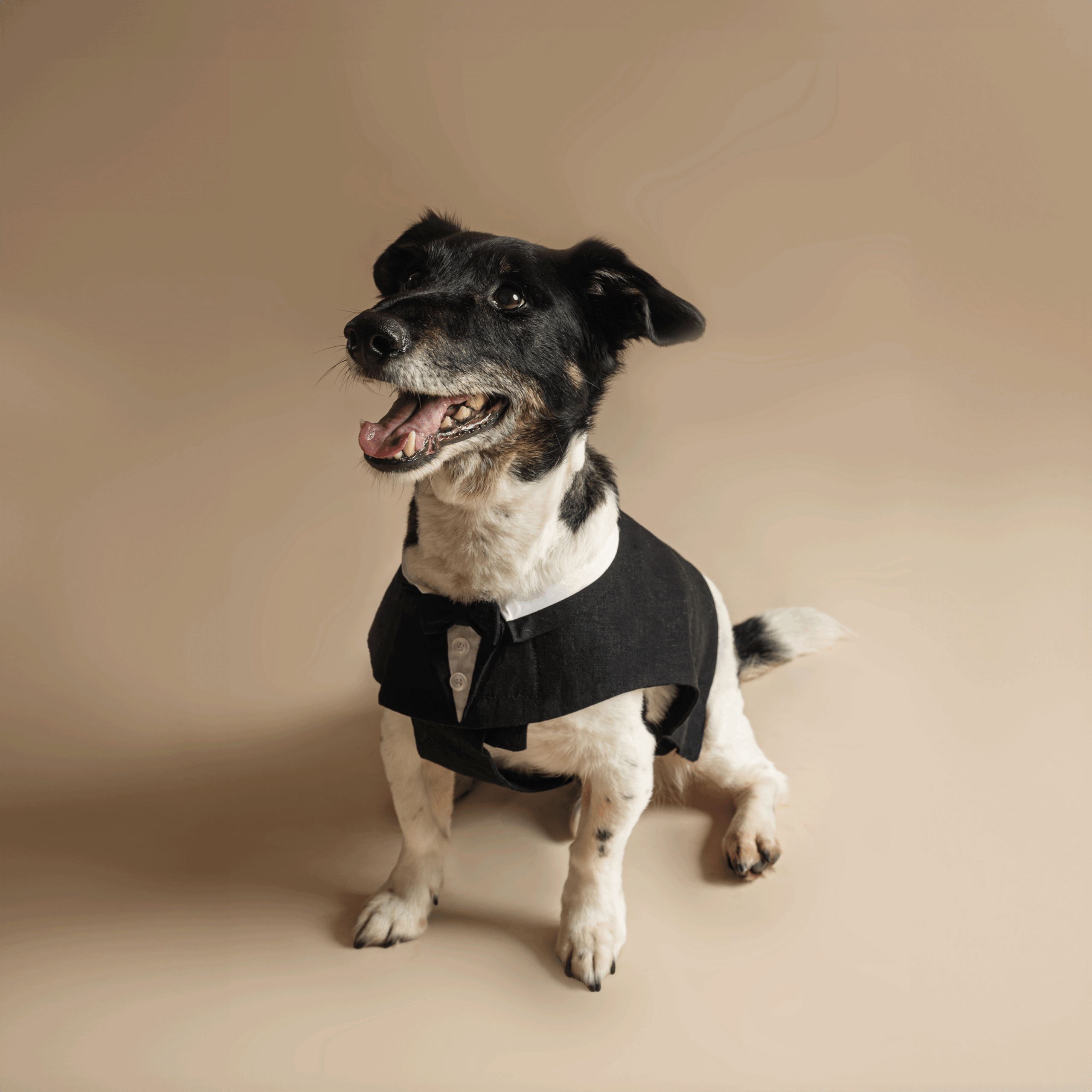„Groomy” ruhánk visszahozza a férfi öltönyök eleganciáját és pompáját a jeles alkalmak és esküvők napjára. Letisztult fekete-fehér színvilágával szinte minden esküvőn tökéletes választás. Kiemelkedő részletgazdagsága és cserélhető nyakkendője varázslatossá teszi megjelenését. Anyaghasználatunk és tervezésünk során kiemelt figyelmet fordítottunk a nyári időjárásra. Könnyed és légies anyagokat választottunk, emellett a ruha hátsó részét lerövidítettük, hogy biztosítsuk a szellőzést és a kényelmet a melegben. Ennek köszönhetően ideális választás szinte minden háthosszú kutya számára.