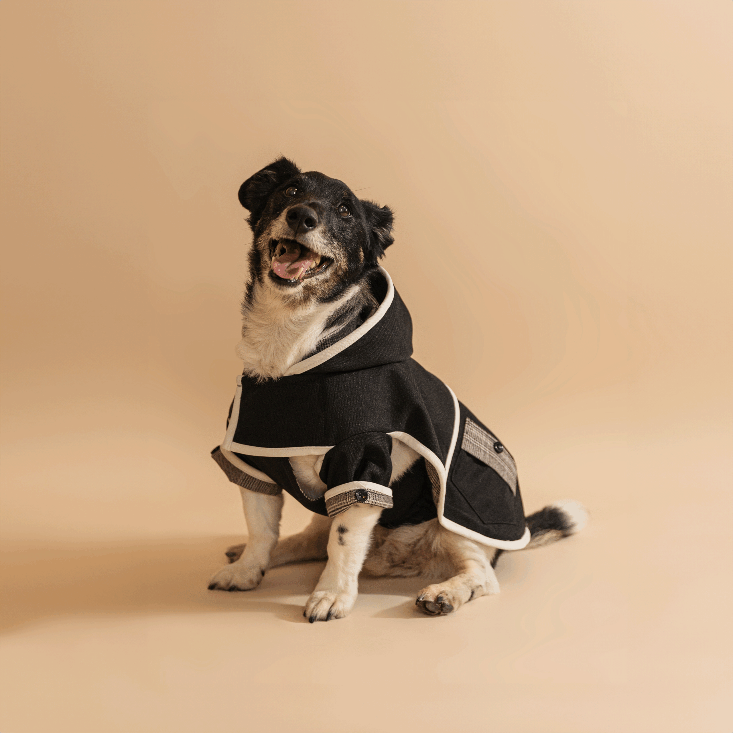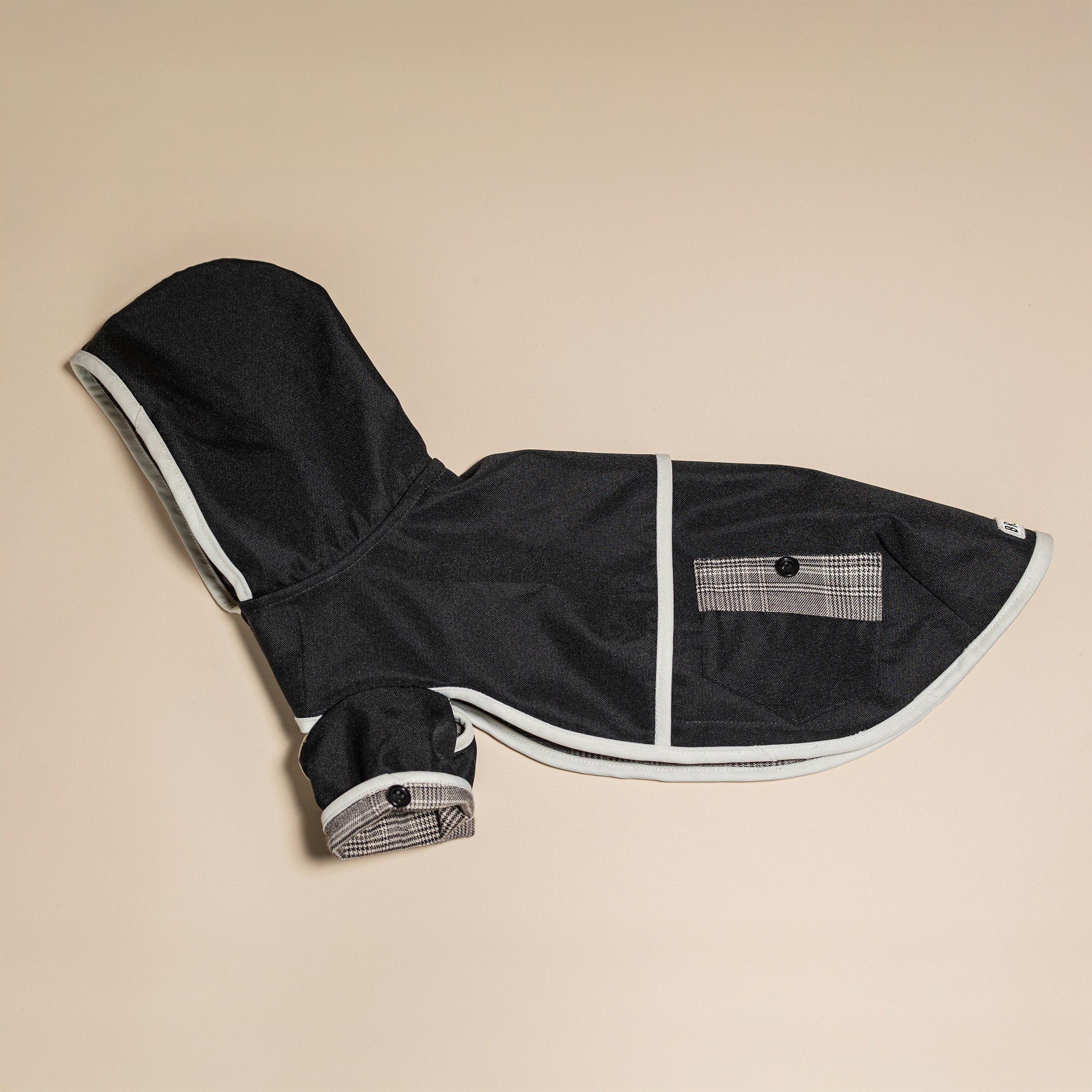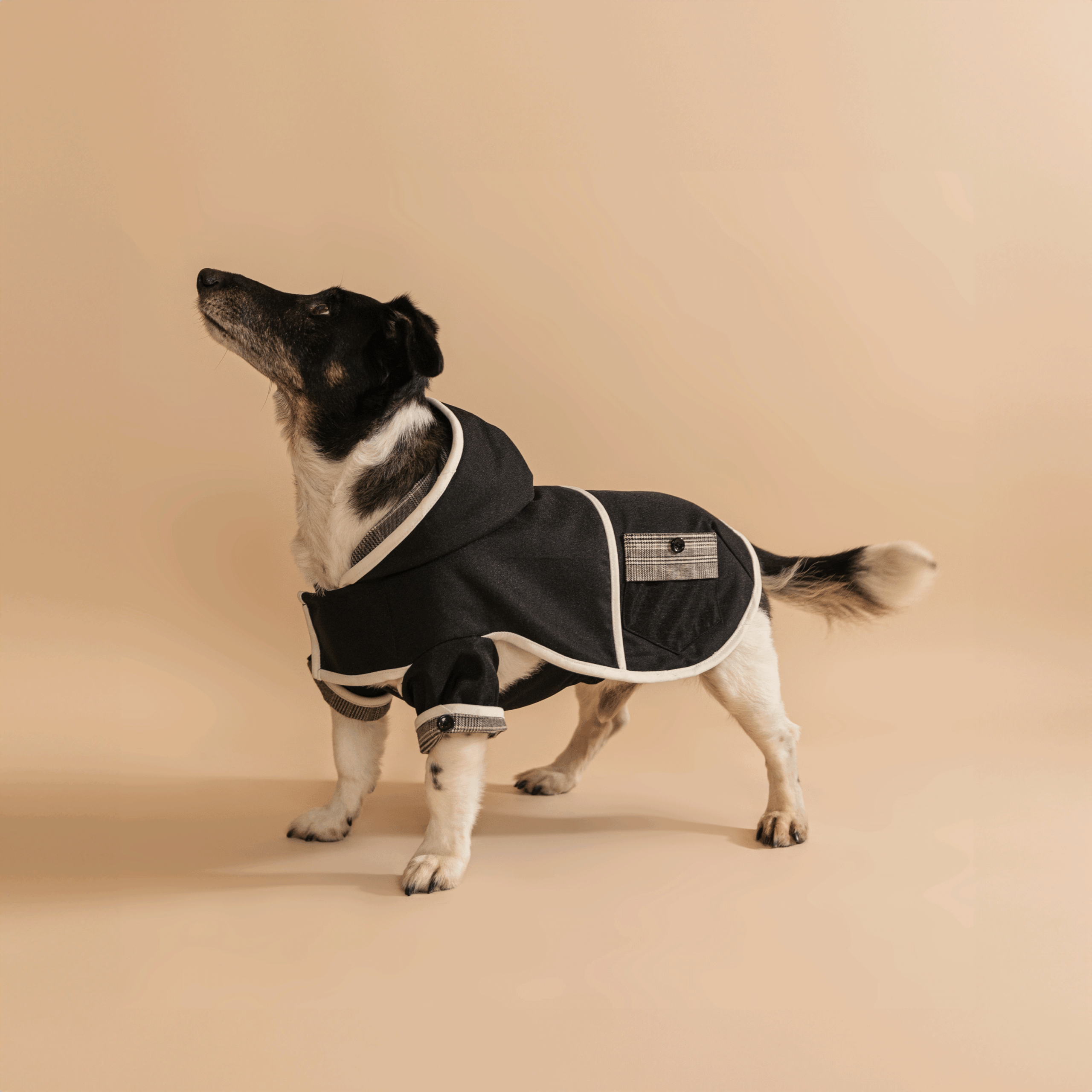 „Midnight” ruhánk a modern eleganciát és funkcionalitást ötvözi. A kívül fekete víztaszító anyag és belső szürke kockás szövet elegáns kontrasztot alkotnak, míg a fehér paszpol és a fekete akril gombok modern, kifinomult megjelenést biztosítanak, miközben sportos vonalat kölcsönöznek. A ruha tökéletes választás, hogy kutyája stílusosan és védetten átvészelje a hűvösebb, esős napokat.