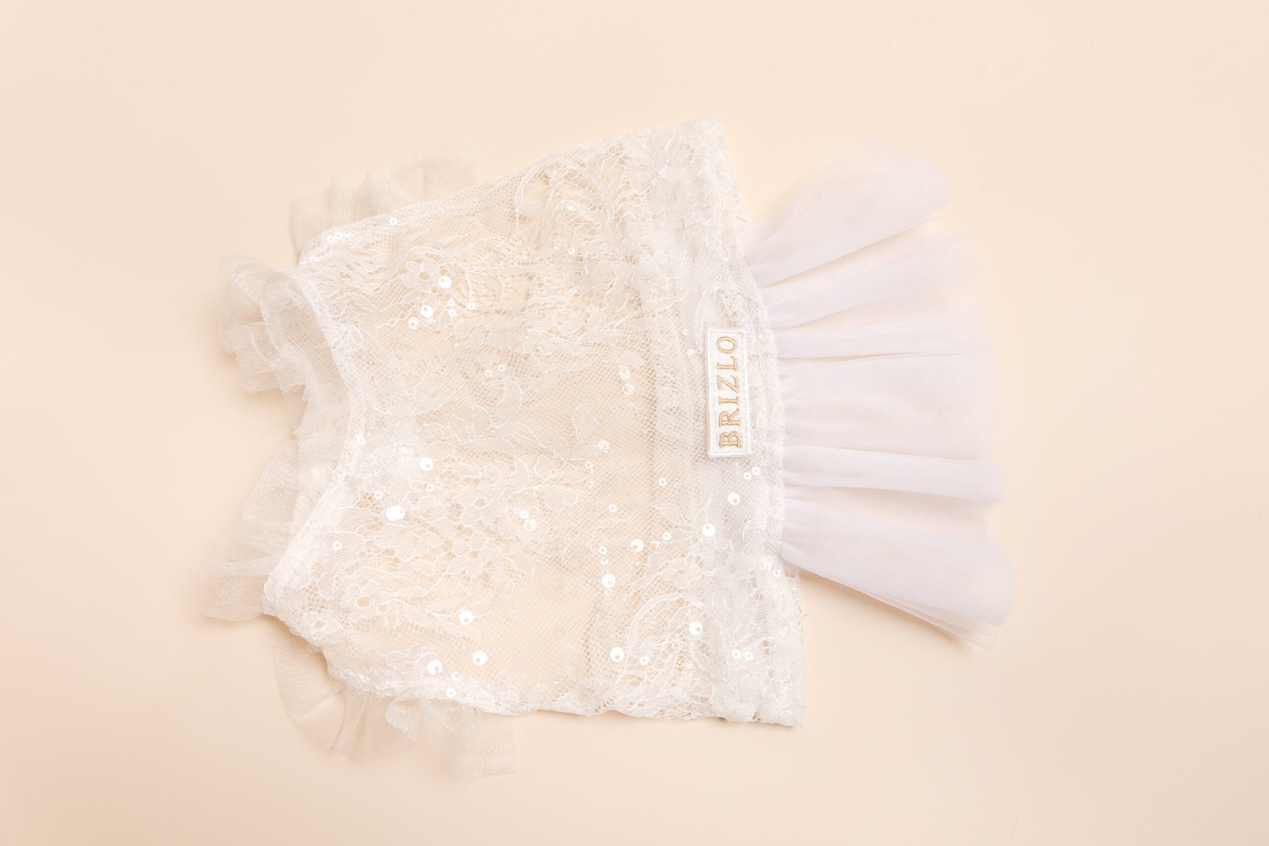 A ruha lágy fehér árnyalata és a részletekben rejlő kifinomultság különleges megjelenést kölcsönöz kedvencednek. A puha madeira csipke nemcsak elegáns, de szellős és komfortos is, így kutyusod a melegben is kényelmesen érzi magát. A hátán elhelyezett apró tüll dísz és a klasszikus fazon harmóniát teremt a menyasszonyi öltözettel, miközben a gombos, állítható pántok biztosítják a tökéletes illeszkedést.