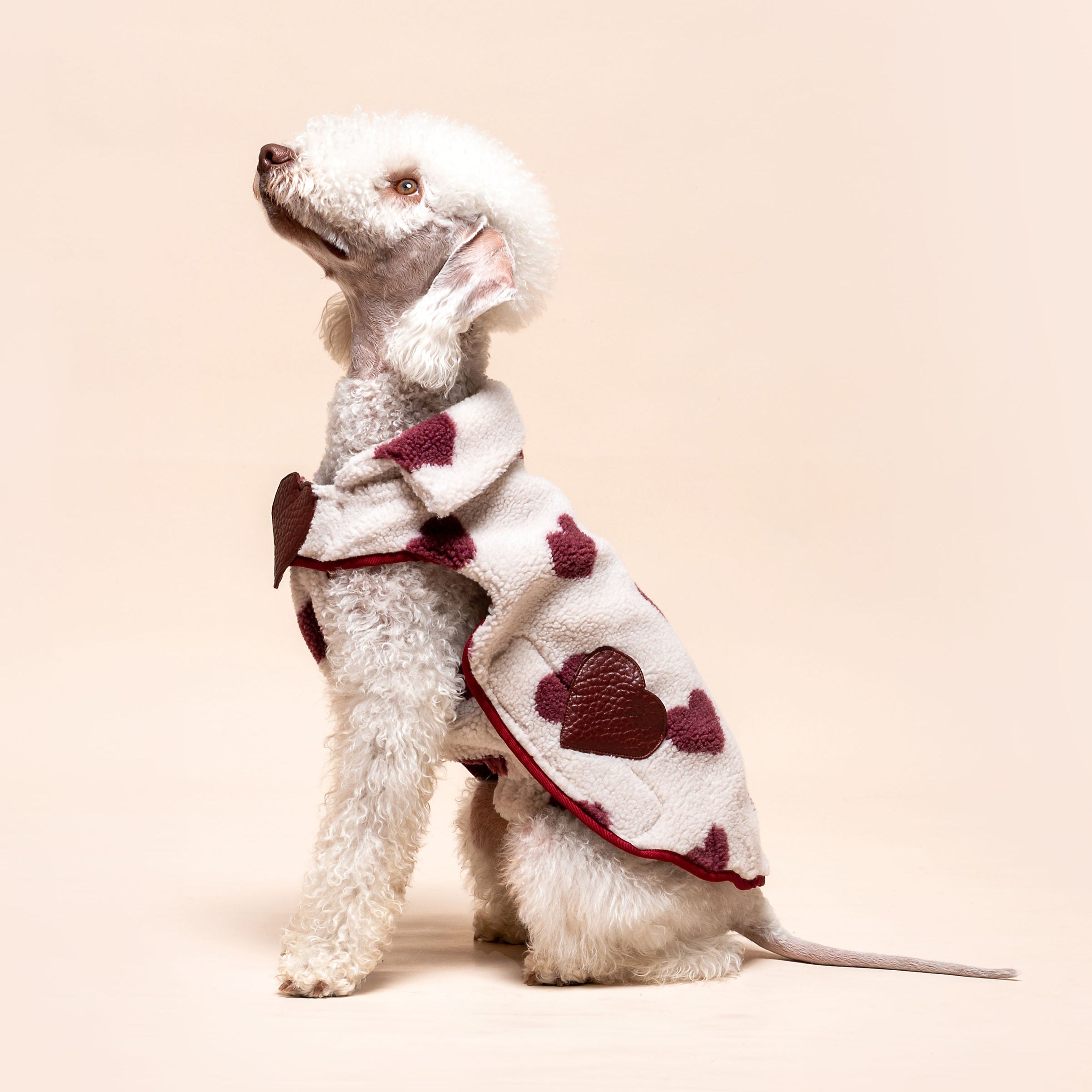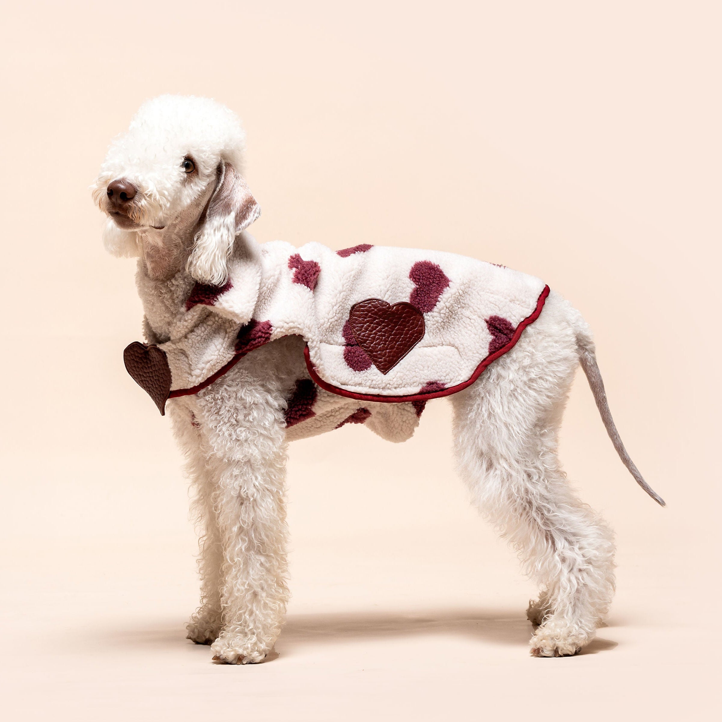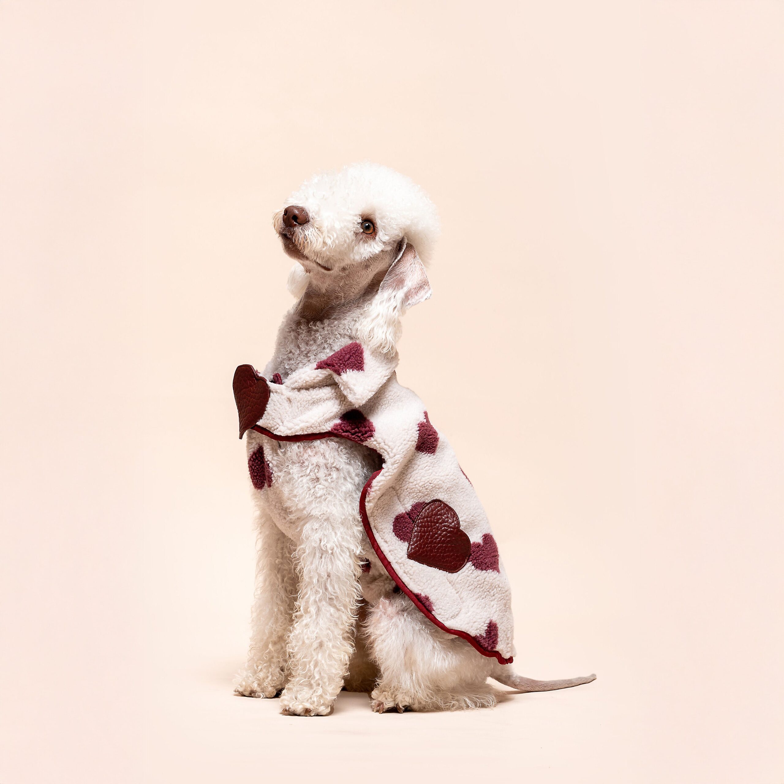 A Valentin teddy kabát a Wild Cherry kollekció egyik legbájosabb darabja, amely különleges szívecske mintájával és meleg anyagával azonnal mosolyt csal mindenki arcára. A fehér alapot díszítő bordó szívek és a szív alakú, bőrutánzatból készült applikációk romantikus, mégis játékos hangulatot teremtenek, amely tökéletes választás a vidám és szeretetteljes négylábúak számára.