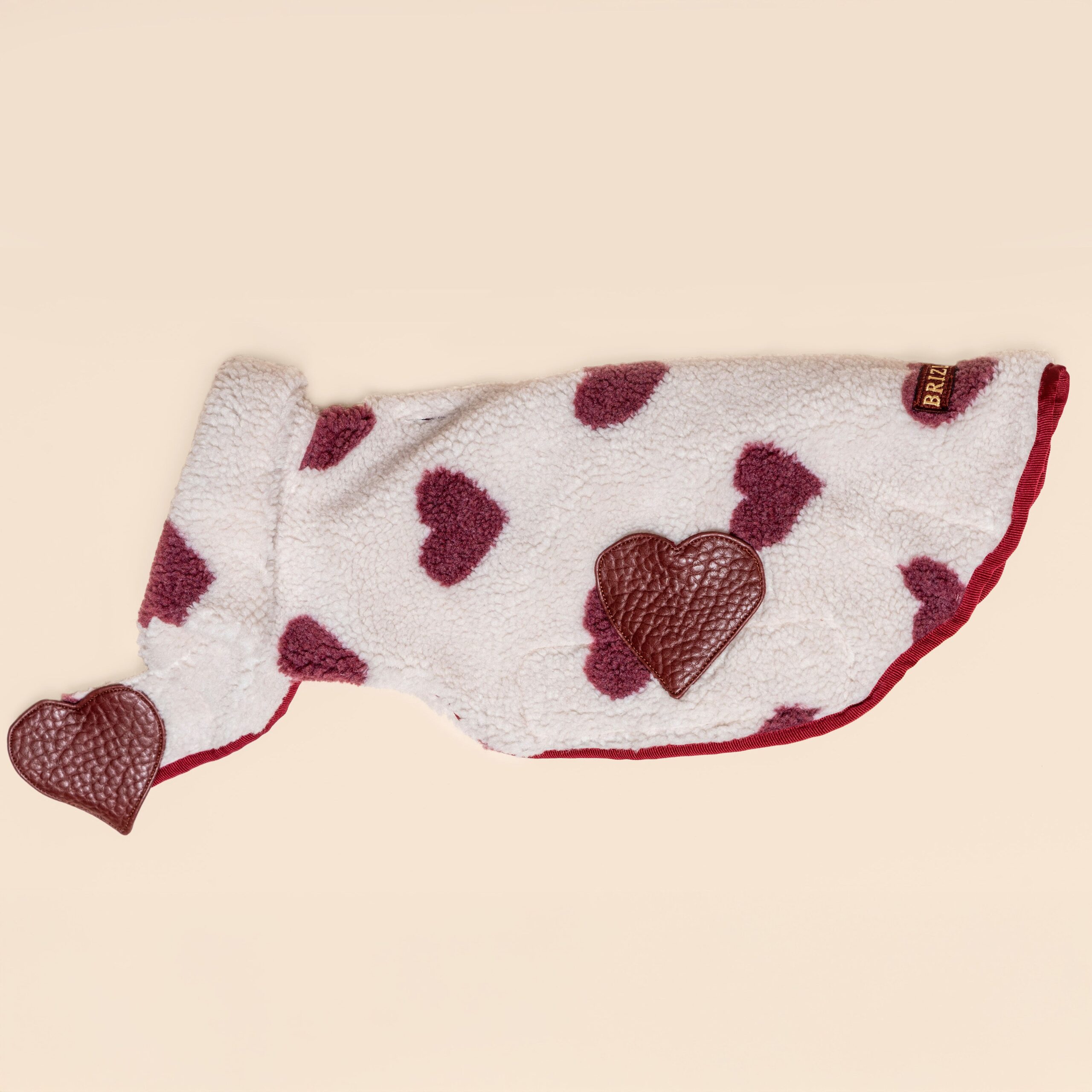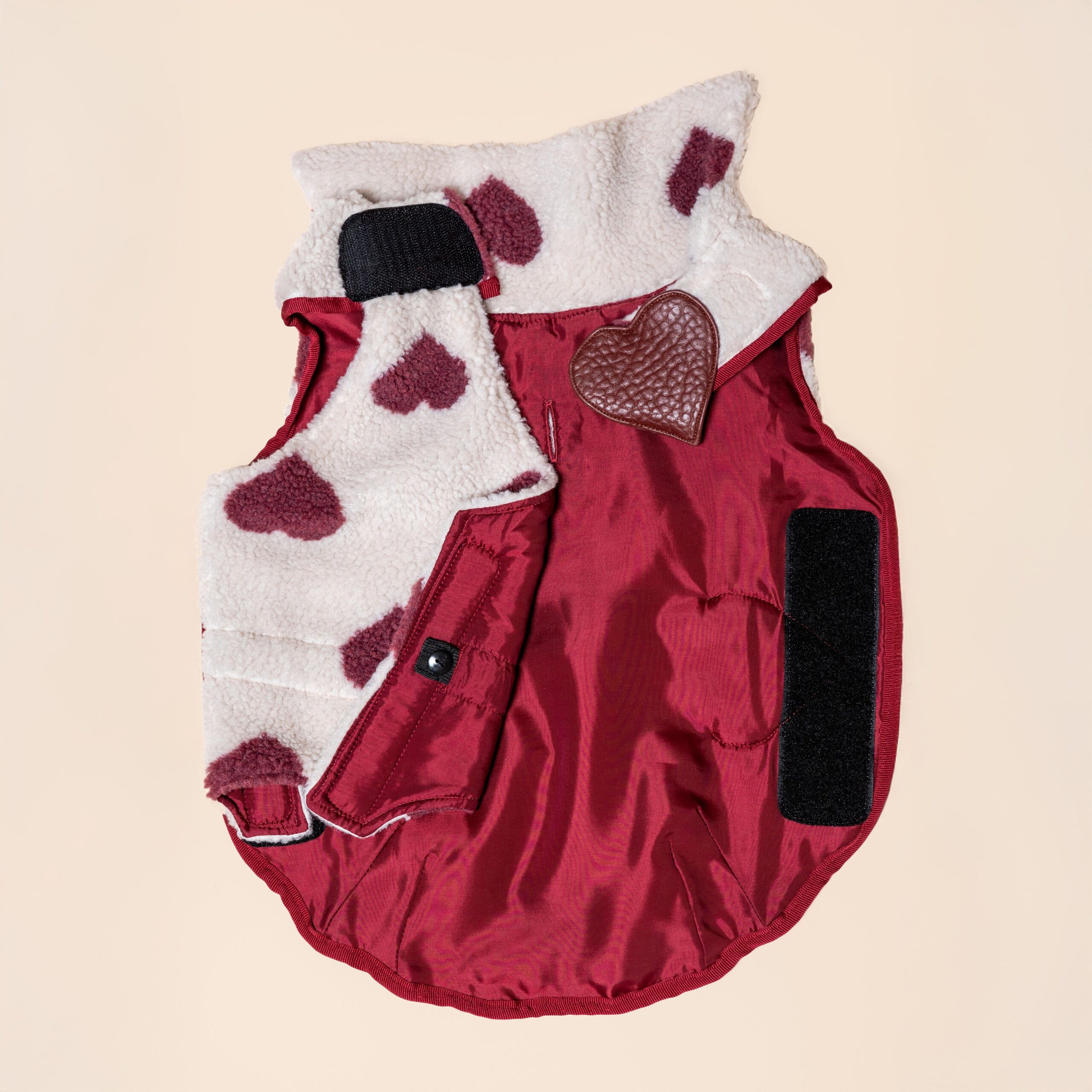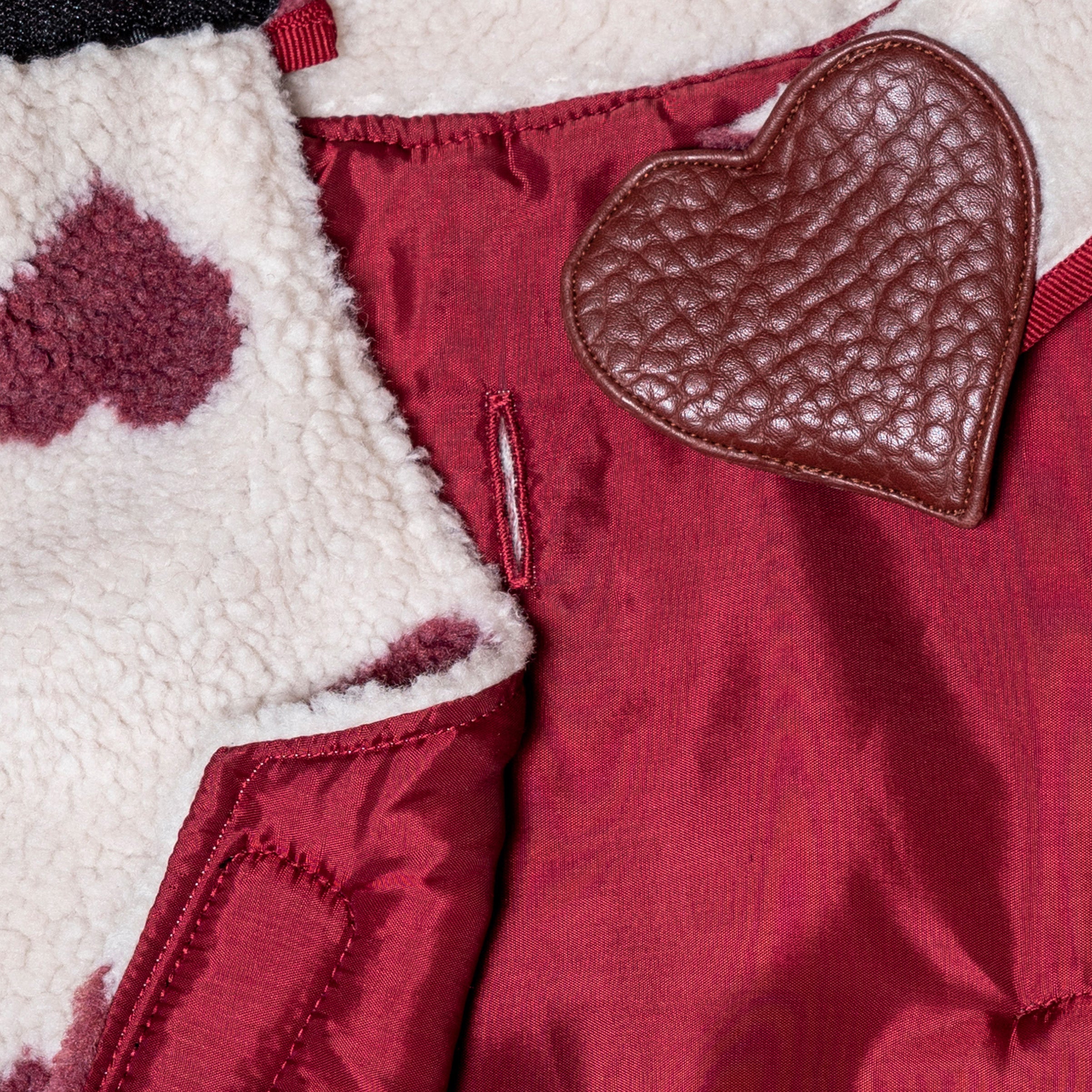 A Valentin teddy kabát a Wild Cherry kollekció egyik legbájosabb darabja, amely különleges szívecske mintájával és meleg anyagával azonnal mosolyt csal mindenki arcára. A fehér alapot díszítő bordó szívek és a szív alakú, bőrutánzatból készült applikációk romantikus, mégis játékos hangulatot teremtenek, amely tökéletes választás a vidám és szeretetteljes négylábúak számára.